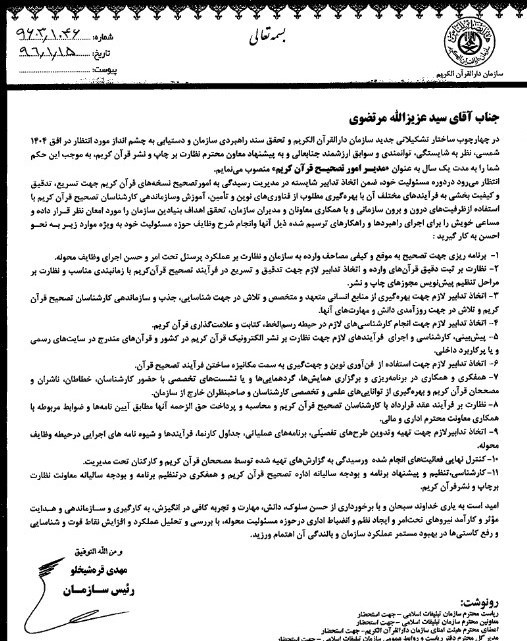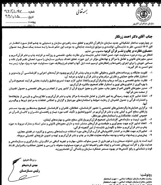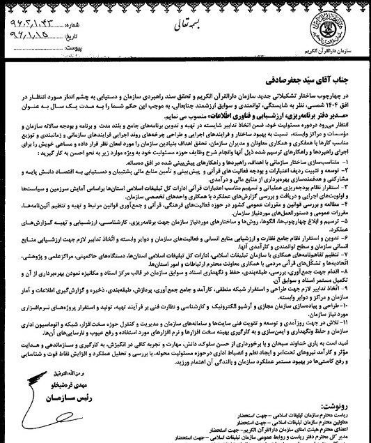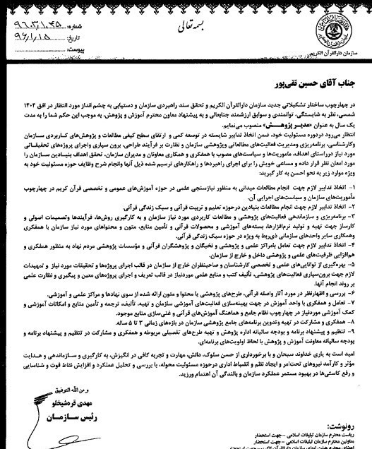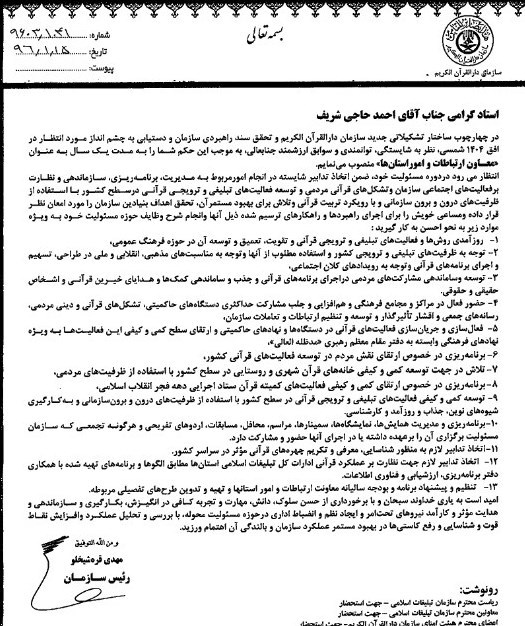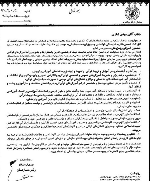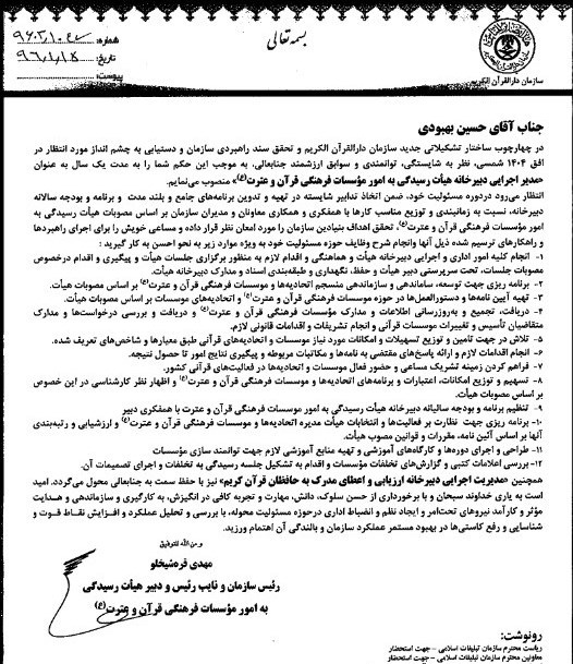 در بخشی از احکام صادر شده از سوی رئیس سازمان دارالقرآالکریم آمده است:
