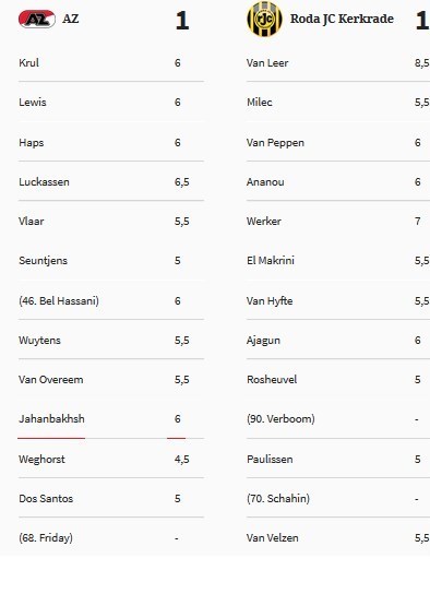 علیرضا جهانبخش، ملی‌پوش ایرانی تیم آلکمار که زننده تنها گل بازی خانگی برابر تیم ته‌جدولی رودا بود نیز نمره فنی خوب شش را در مجله فوتبال اینترنشنال هلند به خود اختصاص داد. آلکمار در این بازی با نتیجه تساوی یک - یک متوقف شد.