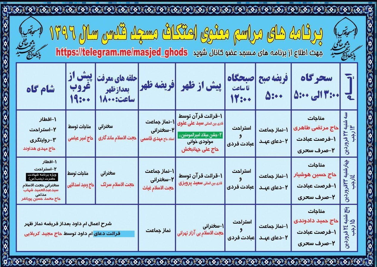 بنا بر این گزارش، واحد فرهنگی مسجد قدس برای بهره‌مندی معتکفین ویژه‌برنامه‌ای در طول این سه‌روز اجرا خواهد کرد که مشروح برنامه‌ها در جدول ذیل قرار گرفته است.