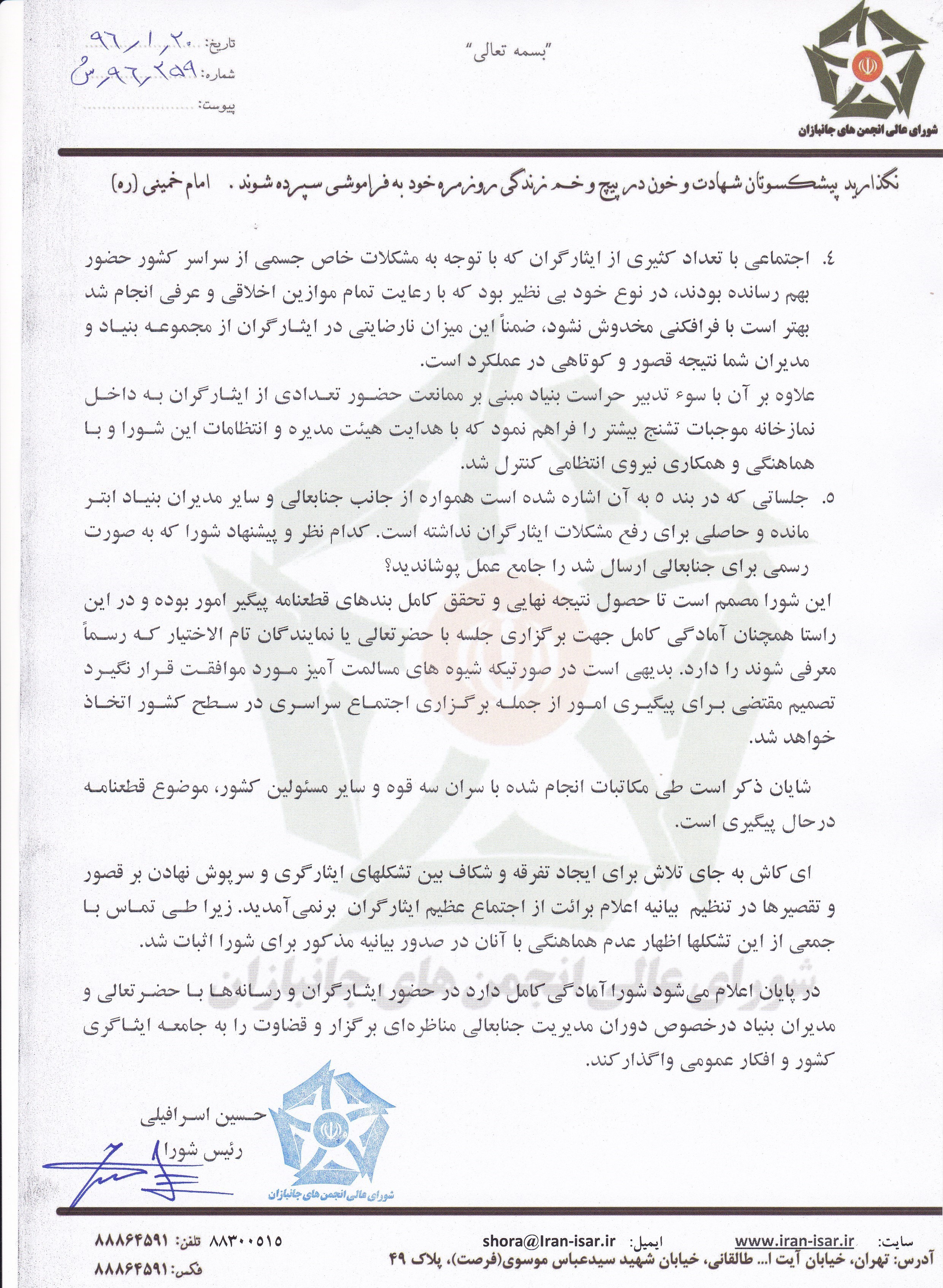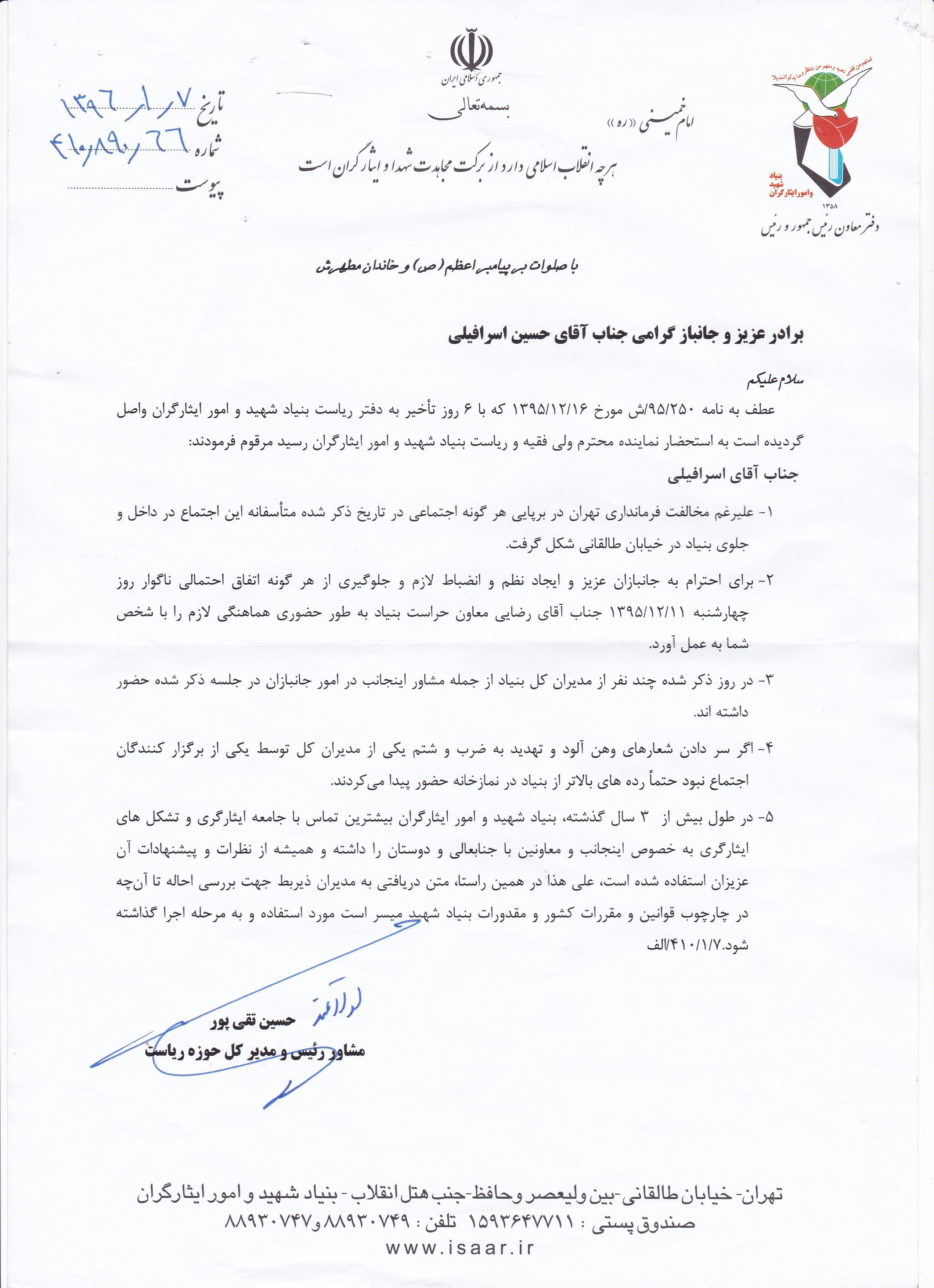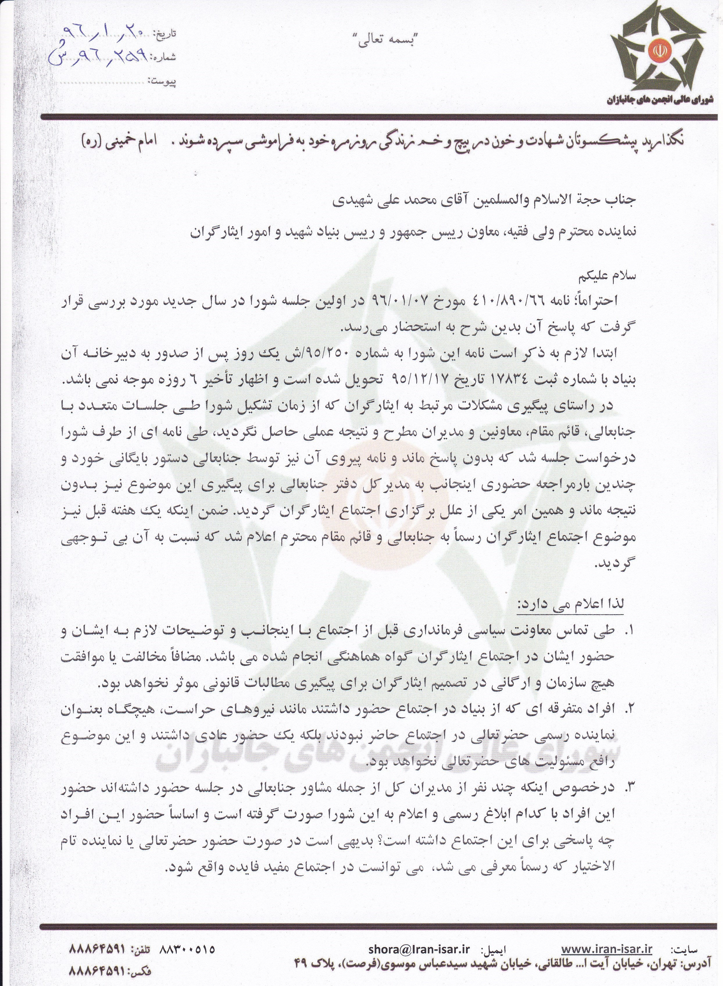 متن و تصویر نخستین نامهای که در این روند از سوی بنیاد شهید در پاسخ به موارد عنوان شده به شورای عالی جانبازان ارسال شد در ادامه قابل مشاهده است. این نامه در 7 فروردین 96 ارسال شده است: