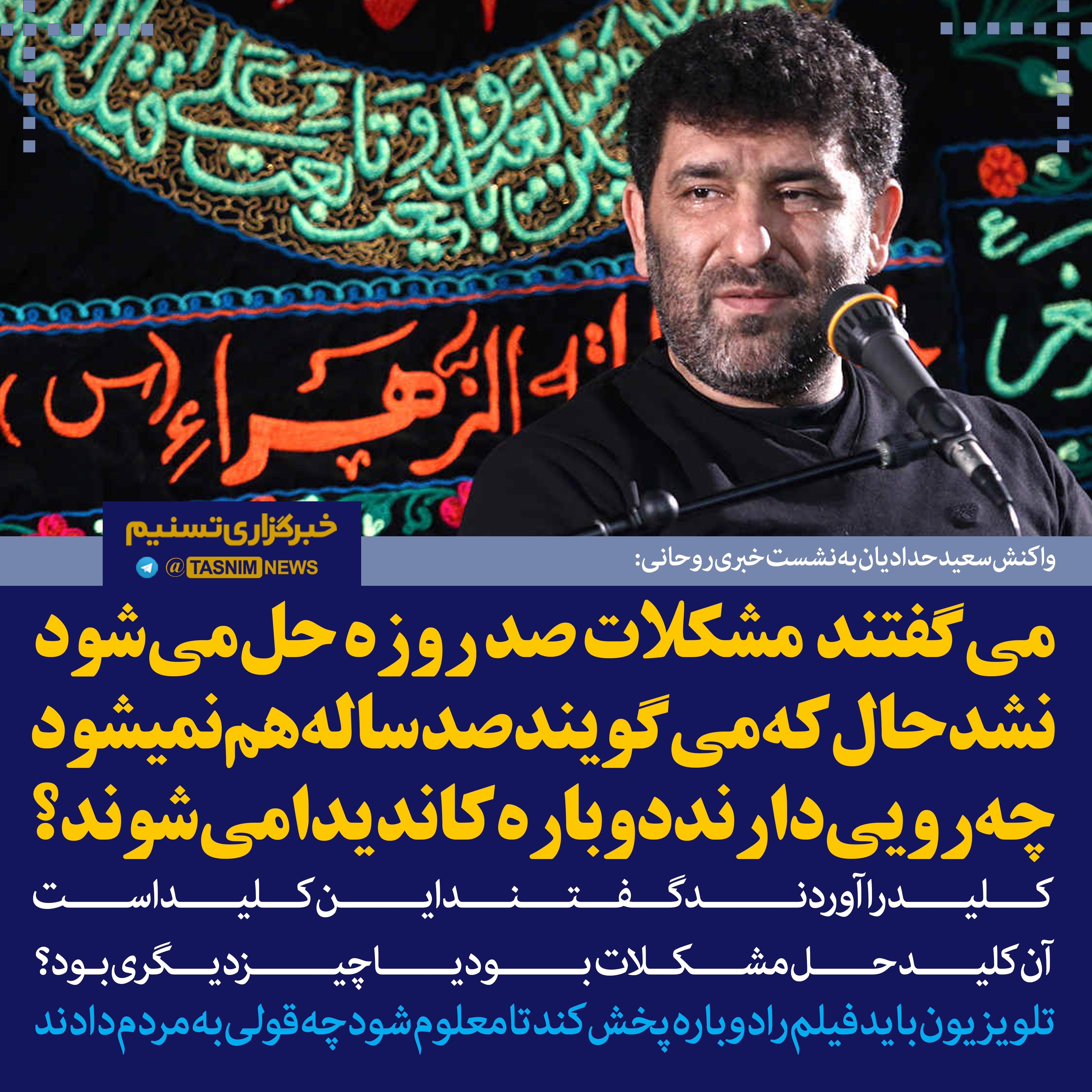 مداح معروف تهران گفت :کلید را آوردند گفتند این کلید است؛ آن کلید حل مشکلات بود یا چیز دیگری بود؟ پس وعده صد روزه چه بود؟ گفته بودند صد روز دیگر مصاحبه می کنم؟!