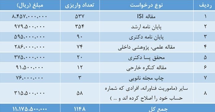 این پرداختها شامل مواردی از قبیل دستاوردهای آئیننامه گامبهگام تأیید شده تا آخر آبان ماه 95، بخشی از مقالات ISI تأیید شده در خرداد ماه 95، پروپوزال ارشد تأیید شده (سهم دانشجو و استاد راهنما) تا مرداد ماه سال 95، پروپوزال دکتری تأیید شده (سهم دانشجو و استاد راهنما) در مرداد ماه سال 95، حمایت از مجلات در حوزه فناوری نانو و محققان پسادکتری تأیید شده است.