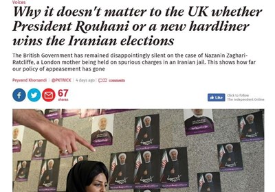 نشریه ایندیپندنت انگلیس نیز روز یکشنبه در گزارشی درباره انتخابات ریاست جمهوری آتی ایران، به زعم خود ادعا کرد برای دولت انگلیس مهم نیست چه کسی رئیس جمهوری آتی ایران شود، زیرا از دید آنها تمامی سیاستمداران ایرانی «تندرو» هستند. با این حال این نشریه در ابتدای گزارش خود طی چندین خط بدون نام بردن از حجت الاسلام رئیسی، تهمتها و ادعاهای بدون استنادی را علیه وی مطرح کرده و نوشته است که ورود وی به رقابتها، تهدیدی برای روحانی خواهد بود «اما واقعیت دردناک این است که در واقع هیچ اهمیتی ندارد، زیرا تاریخ ایران نشان میدهد که رقابتها در ایران بین تندورها و اصلاحطلبان نیست ... . بلکه بین تندروها و منفعلان است». (لینک مطلب)
