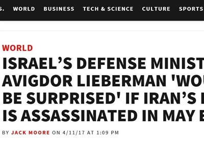 نشریه نیوزویک نیز در گزارشی که روز سهشنبه منتشر کرد به نقل از آویگدور لیبرمن، وزیر جنگ رژیم صهیونیستی نوشت که ترور «حسن روحانی» رئیسجمهوری ایران در جریان انتخابات آتی در این کشور هرگز غافلگیر کننده نخواهد بود, ادعایی که به نظر میرسد با هدف القای حس ناامنی به مردم کشورمان بیان شده است. (لینک مطلب)