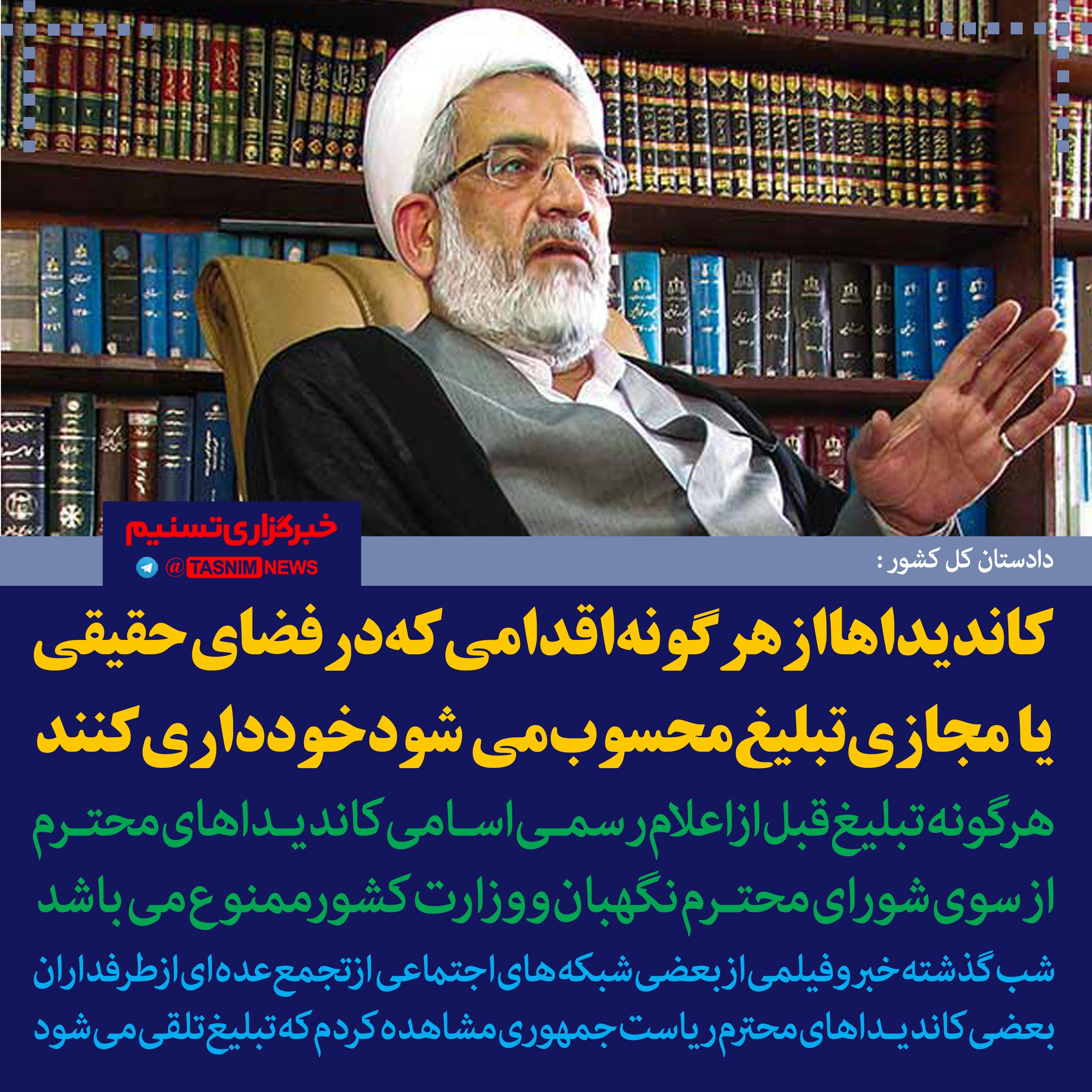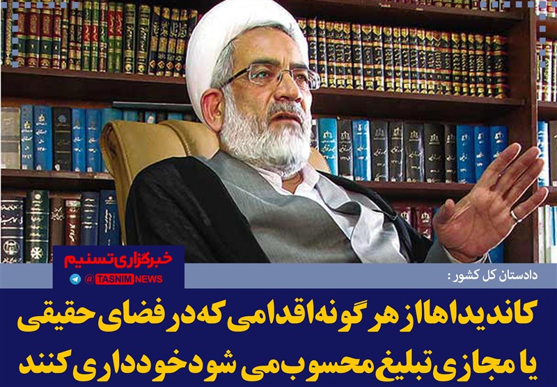 فتوتیتر/دادستان کل کشور:‌کاندیداها‌ازهرگونه‌اقدامی‌که‌درفضای حقیقی‌یا مجازی‌تبلیغ‌محسوب‌می شود‌خودداری‌کنند