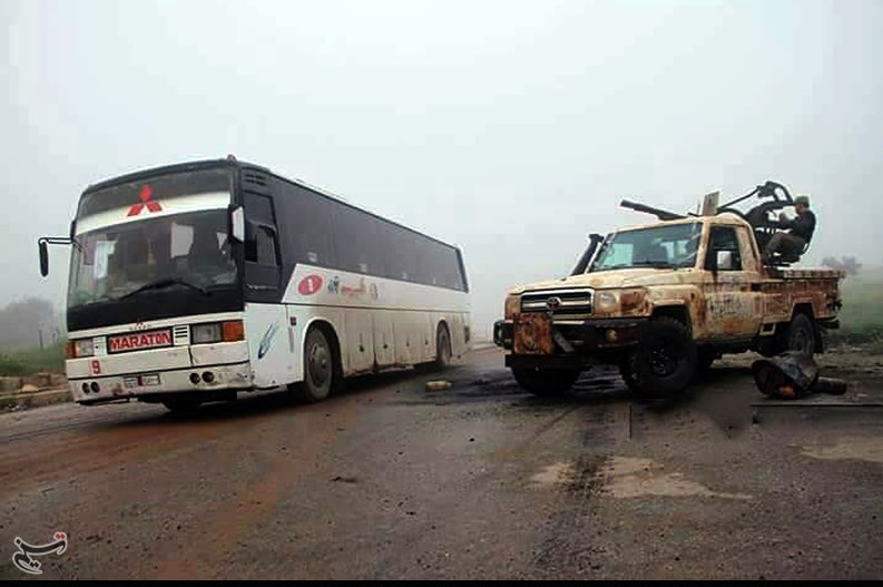 اتوبوسهای حامل افراد مسلح الزبدانی و مضایا که در ایست بازرسی ارتش سوریه مستقر هستند