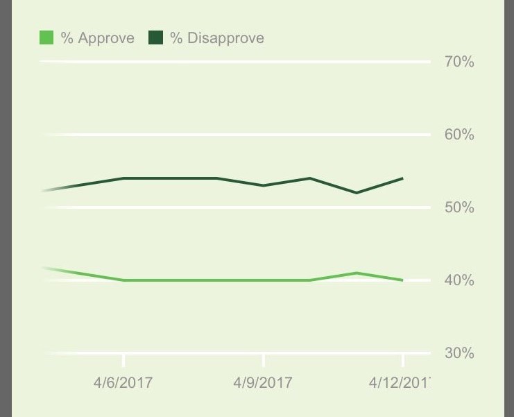 «اریک بوهلرت»، نویسنده و تحلیلگر مسائل بینالمللی در حساب کاربریاش در شبکه اجتماعی توئیتر نتایج یک نظرسنجی را منتشر کرده که نشان میدهد روند نزولی وضعیت ترامپ در نظرسنجیها بعد از حمله به پایگاه الشعیرات سوریه (4/6/2017) کماکان ادامه دارد.