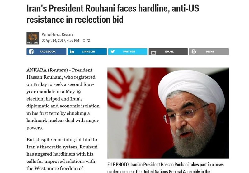 به گزارش گروه بینالملل خبرگزاری تسنیم، رویترز در گزارشی که روز جمعه (25 فروردین) از انتخابات ریاست جمهوری ایران منتشر کرد، ضمن برشمردن مزایا و امتیازات حسن روحانی، رئیس جمهوری کشورمان، نوشت که با وجود برجام، «تحریمهای متعدد یکجانبه آمریکا مانع از سرمایهگذاریهای خارجی شده است که میتوانست به بهبود اقتصاد (کشور) منجر شود».