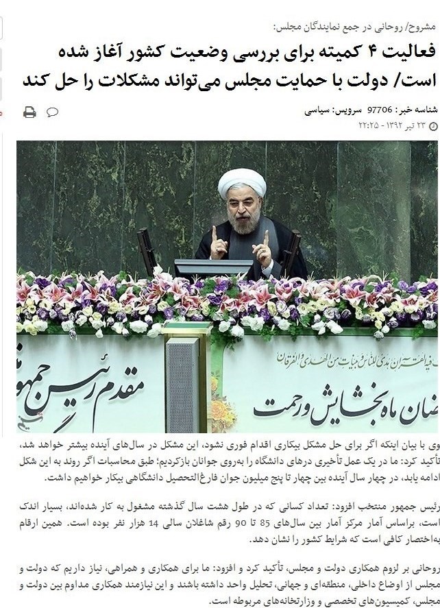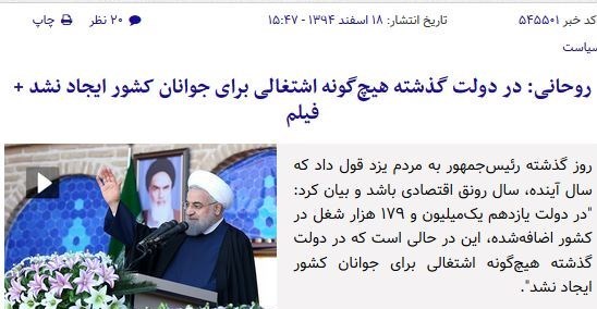 خبری که گویای حقیقت پشتپرده است و آقای رئیس جمهور در ایام تبلیغات و پس از پیروزی در انتخابات آن را انکار کرد، مربوط به آمار واقعی اشتغالزایی در دولت گذشته است، آنجا که وی از ایجاد بیش از دو میلیون شغل در دولت قبل آن هم فقط در چهار سال خبر داده بود.