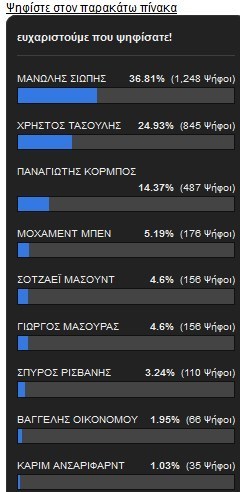 در این نظرسنجی مانولیس سیوپیس، هافبک 22 ساله پانیونیوس با کسب 36.81 درصد آرای هواداران صدرنشین است. مسعود شجاعی و کریم انصاریفرد به ترتیب با آرای 4.6 و 1.3 درصدی رتبههای پنجم و نهم را در اختیار دارند. معیار انتخاب 14 نامزد برتر بر اساس تعداد دقایق حضور آنها در ترکیب تیم پانیونیوس است. در این میان کریم انصاریفرد نیز که در فصل نقلوانتقالات زمستانی اروپا از پانیونیوس به المپیاکوس پیوست به خاطر حضور مستمر در بازیهای نیمفصل اول پانیونیوس به جمع نامزدهای برتر تیم پیشین خود راه یافت.