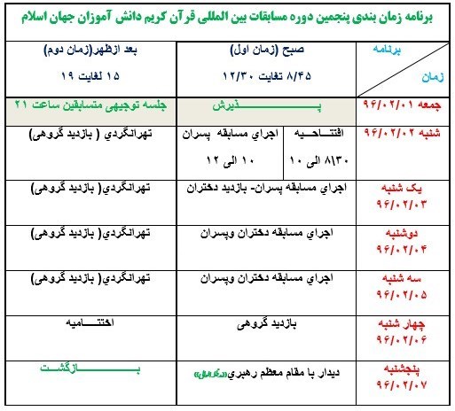 بر پایه این گزارش، جدول زمانبندی پنجمین دوره مسابقات بینالمللی قرآنکریم دانشآموزان جهت اطلاع مخاطبان به شرح ذیل قرار گرفته است.