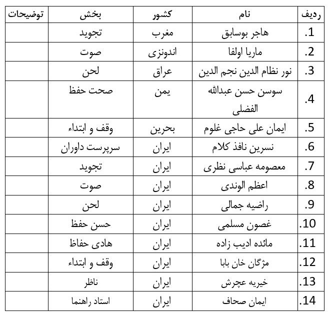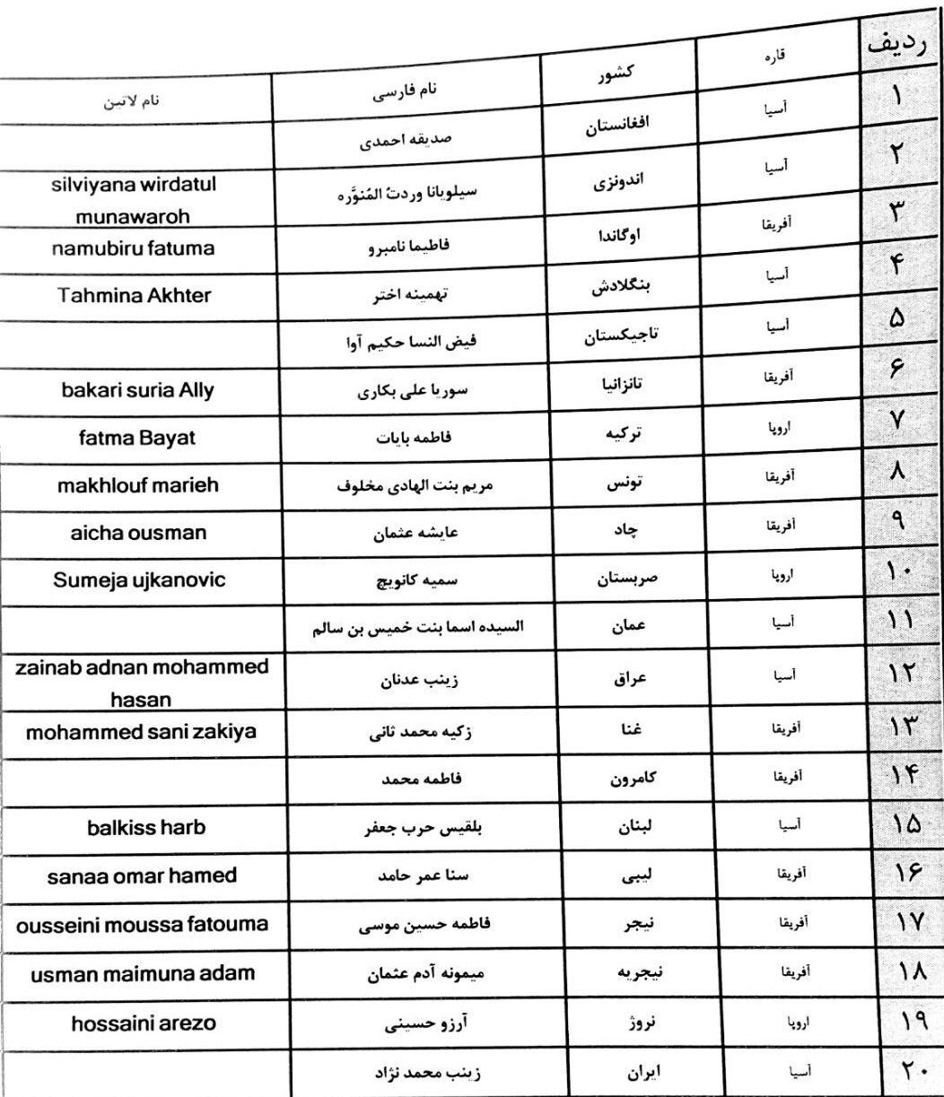 اسامی متسابقان نخستین مسابقات بینالمللی قرآنکریم در بخش بانوان در جدول زیر منتشر شده است.