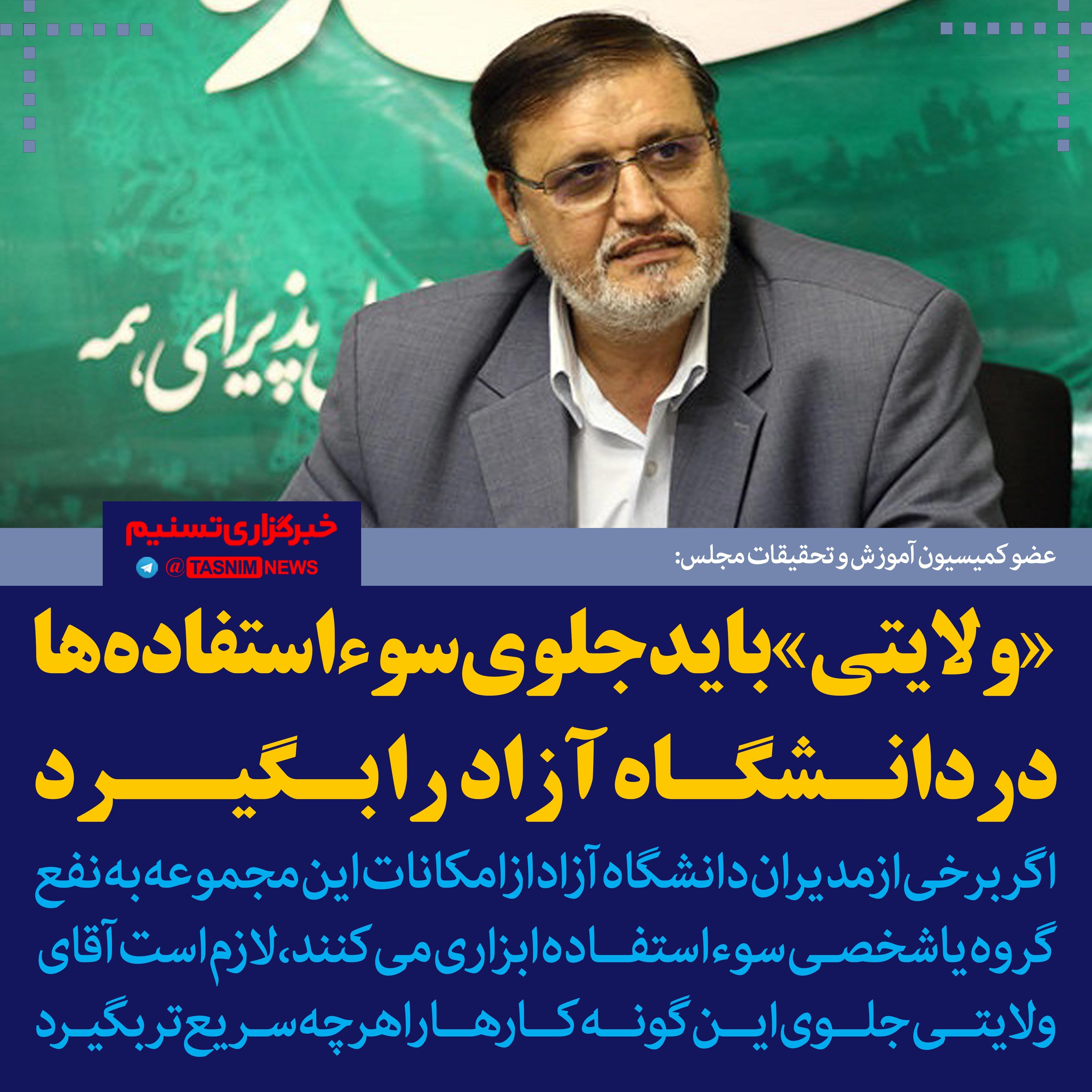 عضو کمیسیون آموزش و تحقیقات مجلس شورای اسلامی گفت: اگر مستنداتی مبنی بر سوءاستفاده از امکانات دانشگاه آزاد به کمیسیون آموزش واصل شود به‌عنوان کمیسیون تخصصی به آن رسیدگی می‌کنیم.