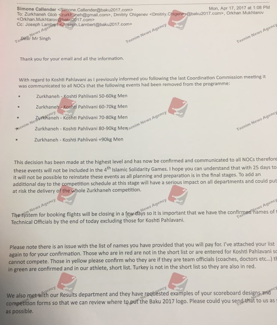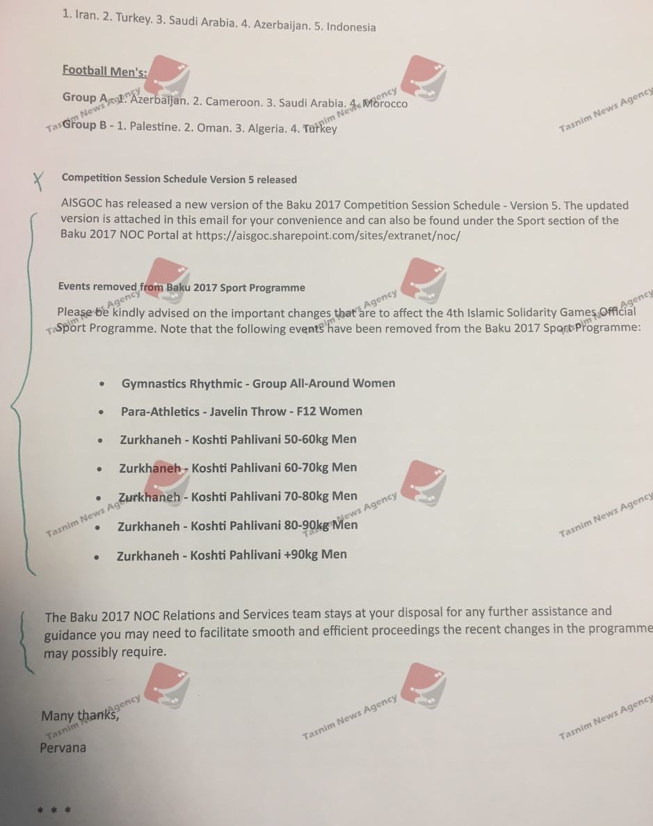 در این نامه رسماً اعلام شده که رشته کشتی پهلوانی از مسابقات کشورهای اسلامی کنار گذاشته شده و با توجه به فاصله زمانی کمی که تا شروع مسابقات وجود دارد، حضور دوباره این رشته امکانپذیر نیست چرا که ممکن است حضور این رشته یا افزایش روزها روی برنامه مسابقات تأثیر منفی بگذارد.