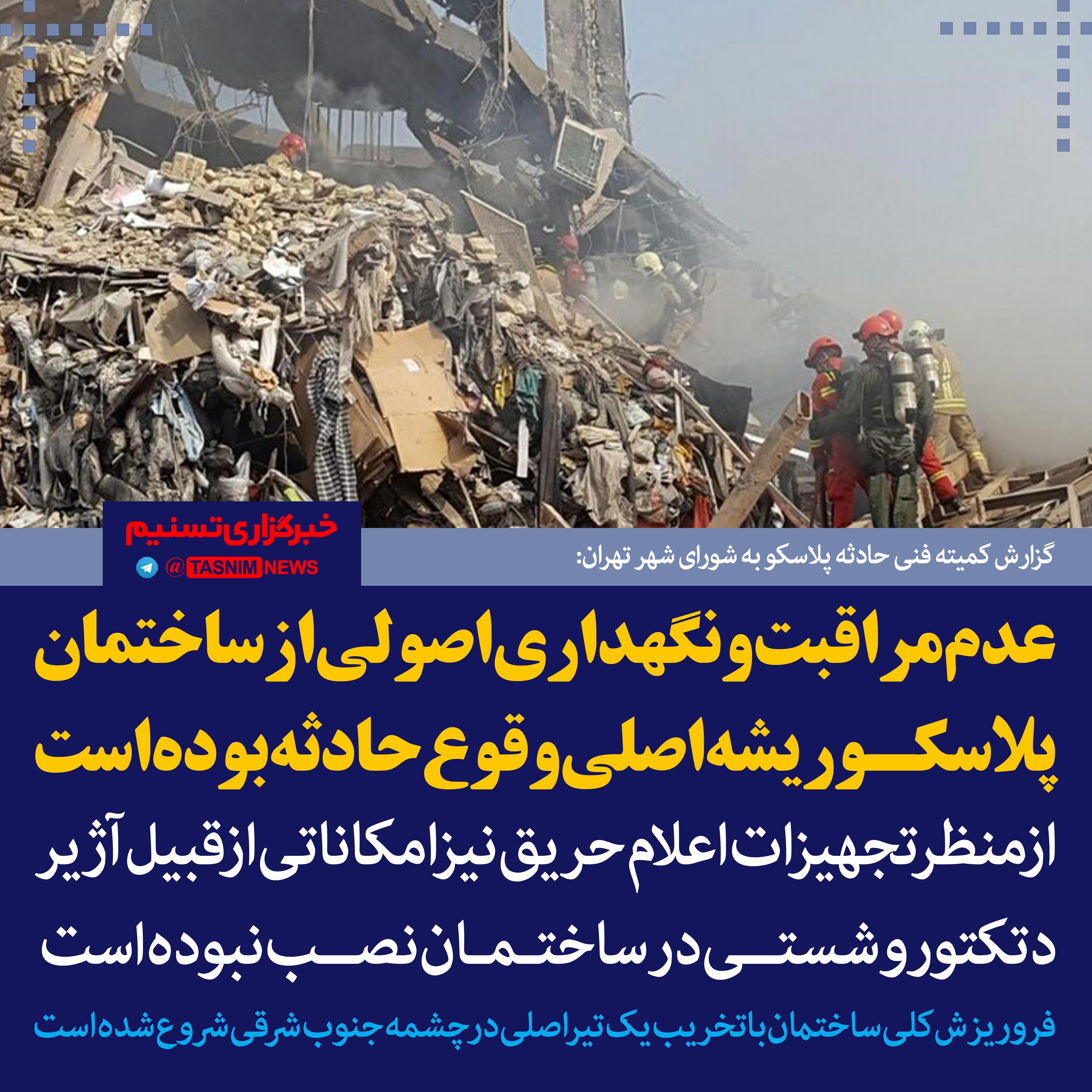 گزارش فنی و حقوقی حادثه ساختمان پلاسکو صبح امروز در جلسه علنی شورای شهر تهران طرح و بررسی شد و بر اساس این گزارش ریشه اصلی وقوع حادثه تلخ ساختمان پلاسکو، عدم مراقبت و نگهداری اصولی از این ساختمان در طول دوره بهره‌برداری 54 ساله ساختمان بوده است.