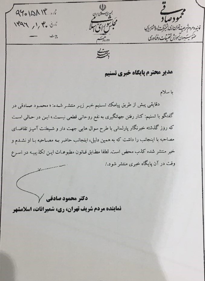 به گزارش خبرنگار سیاسی خبرگزاری تسنیم، روز گذشته محمود صادقی نماینده مردم تهران در مجلس شورای اسلامی طی گفتوگویی با خبرنگار پارلمانی خبرگزاری تسنیم، قطعی بودن انصراف جهانگیری به نفع حسن روحانی را تکذیب نکرده و این مهم را منوط به اقتضای شرایط و صحنه انتخابات دانسته، اما وی در اقدامی غیرحرفهای اصل مصاحبه با خبرنگار تسنیم را تکذیب کرده و مدعی شده که وی حاضر به پاسخگویی به سؤالات خبرنگار تسنیم که به گفته وی، جهتدار و شیطنت آمیز بوده، نشده است.