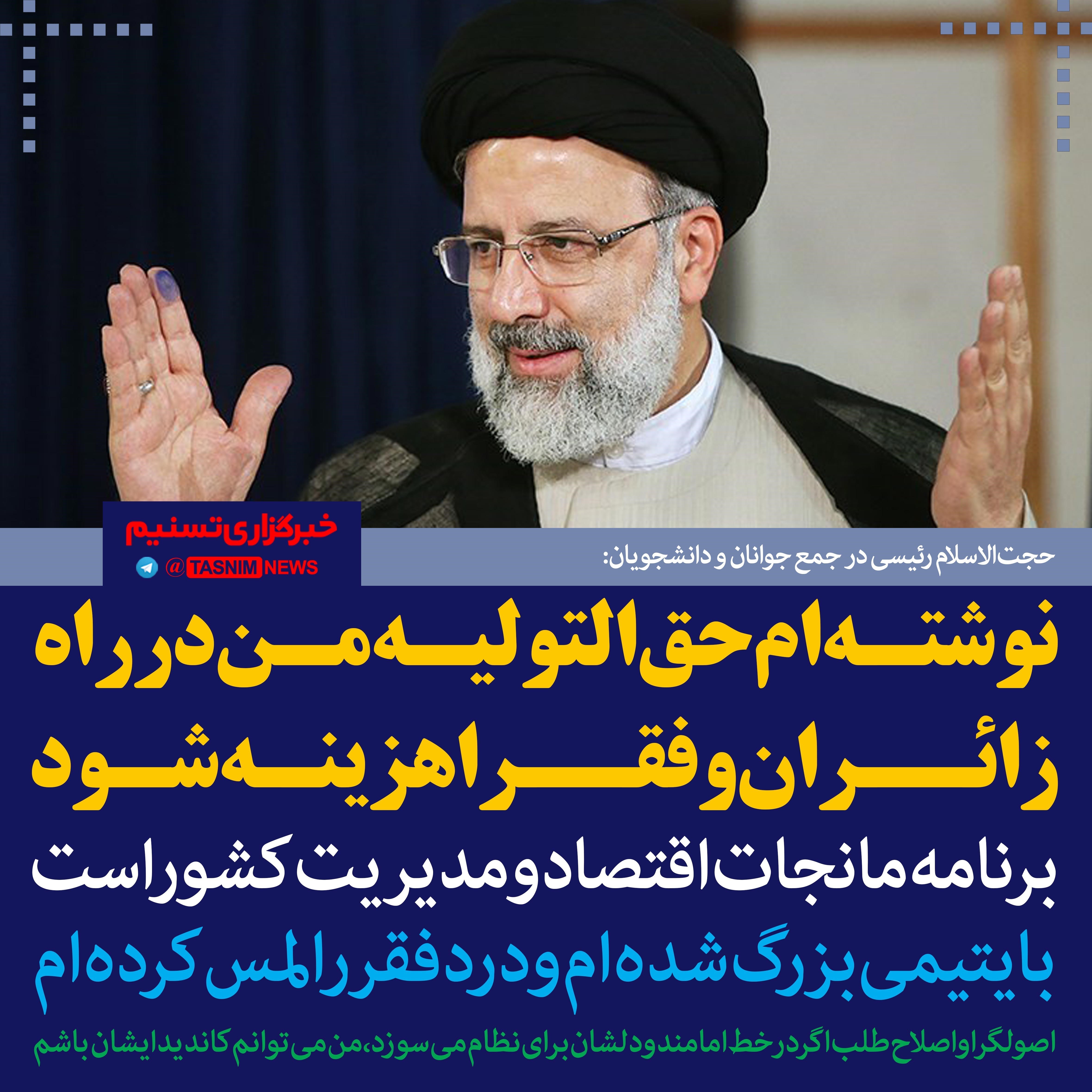 آیت الله رئیسی گفت: فقر و بیکاری زیبنده نظام نیست و برنامه ما نجات اقتصاد و مدیریت کشور است.دولت ما دولت انقلابی خواهد بود.نوشته‌ام حق‌التولیه من در راه زائران امام رضا (ع) و فقرا هزینه شود.با یتیمی بزرگ شده‌ام و درد فقر را لمس کرده ام.