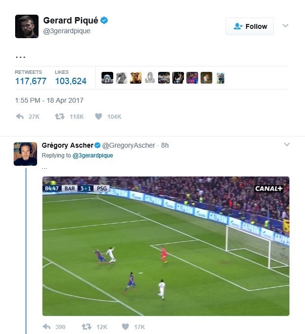 پیکه در واکنش به این اتفاقات در صفحه توییترش عکسی از صحنه گل آفساید کریستیانو رونالدو در وقتهای اضافه و کنار آن سه نقطه گذاشته است تا به نوعی بگوید که هیچ توضیحی برای اتفاقی که رخ داده است ندارد و قضاوت را برعهده بیننده بگذارد.