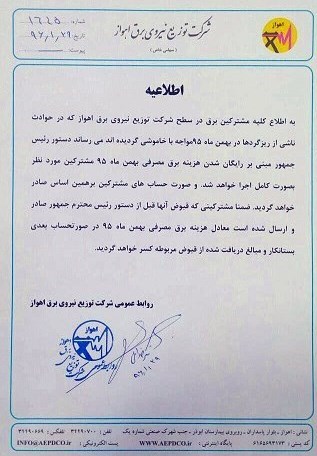شرکت توزیع نیروی برق خوزستان نیز با صدور اطلاعیه ای جداگانه اعلام کرد : دستور رییسجمهوری مبنی بر رایگان شدن هزینه برق مصرفی بهمن ماه 95 مشترکین استان خوزستان به صورت کامل اجرا شده و صورتحسابهای مشترکین بر همین اساس صادر میشود. مشترکینی که قبوض برق آنها قبل از دستور رییس جمهوری صادر و ارسال شده است معادل هزینه برق مصرفی بهمن ماه 95 آنها در صورتحساب بعدی به صورت بستانکار و مبالغ دریافت شده از قبوض مربوطه کسر میشود.
