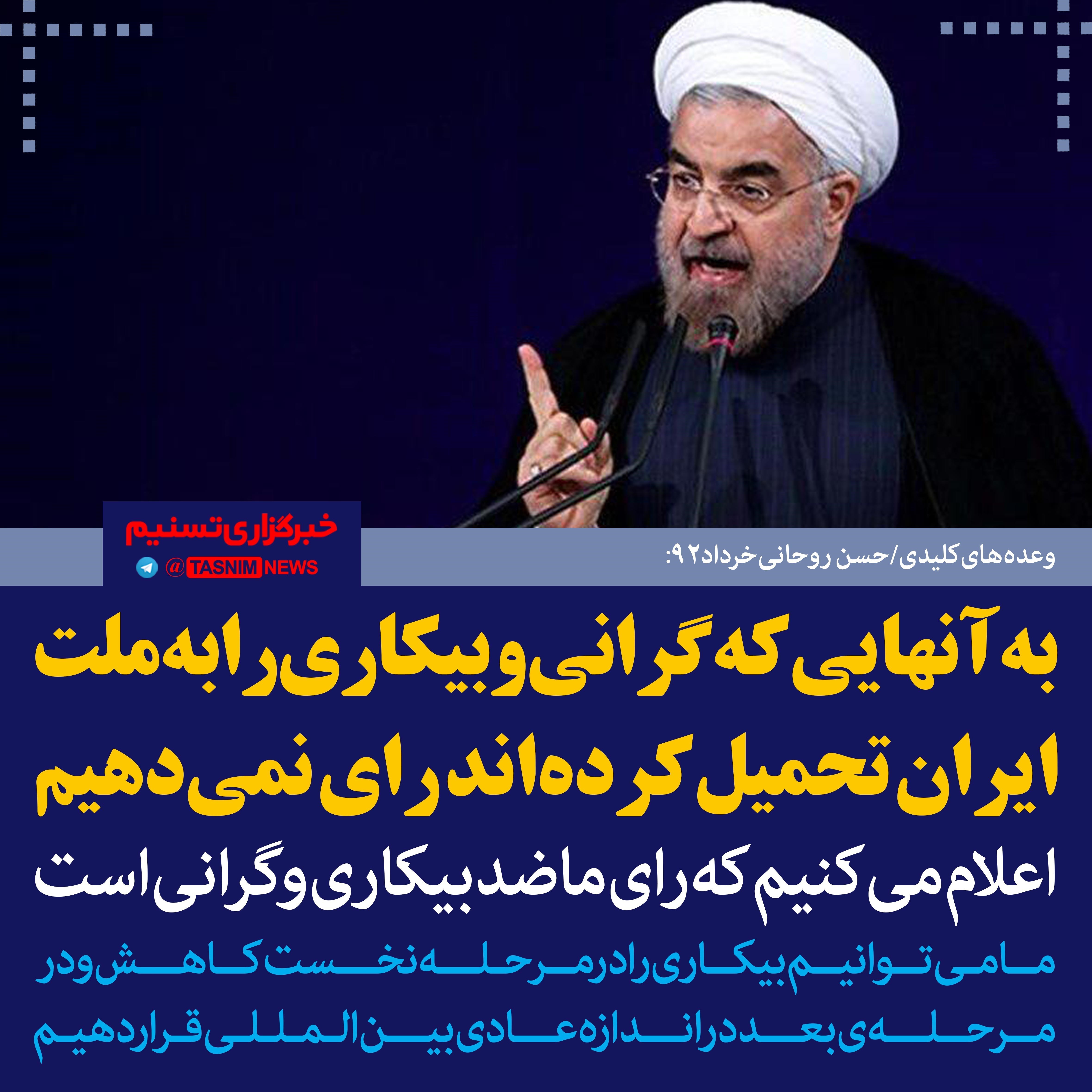 " اعلام می کنیم که رای ما ضد بیکاری و گرانی است و به آنهایی که گرانی و بیکاری را به ملت ایران تحمیل کرده اند رای نمی دهیم."،این جمله از حسن روحانی رئیس جمهور فعلی است که خرداد سال 92 در یکی از سخنرانی‌های تبلیغاتی اعلام شده است.