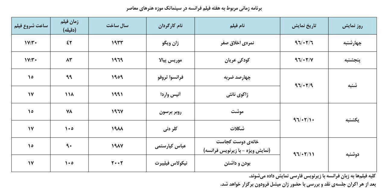 به گزارش خبرنگار فرهنگی باشگاه خبرنگاران پویا، هفته سینمای فرانسه در مجموعه سینماتک موزه هنرهای معاصر تهران با همراهی سفارت فرانسه در تهران برگزار میشود. این برنامه از ششم اردیبهشت 96 تا 11 اردیبهشت در قالب اکران فیلم برگزار میشود.