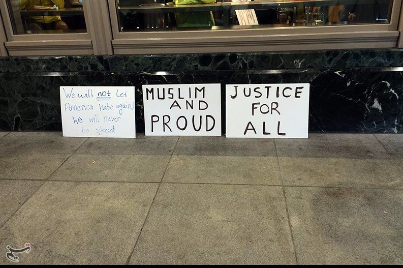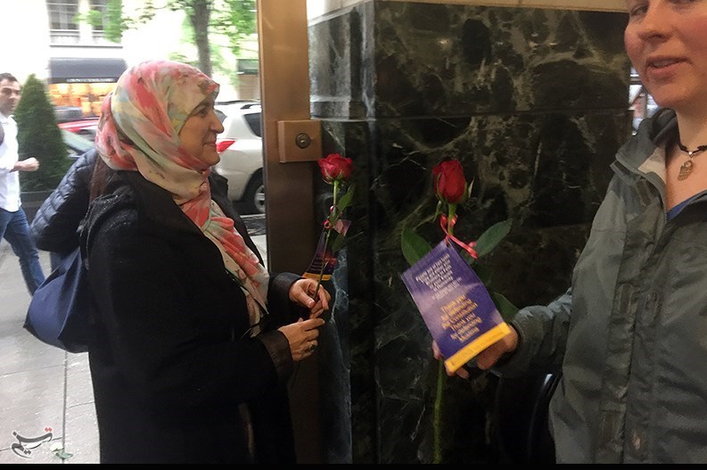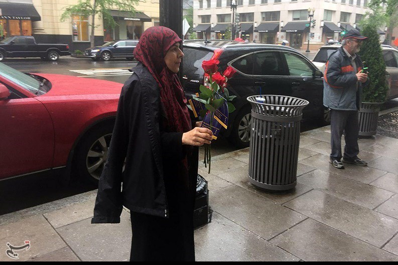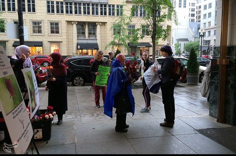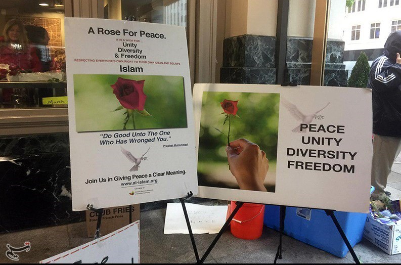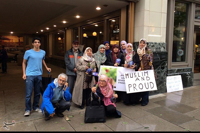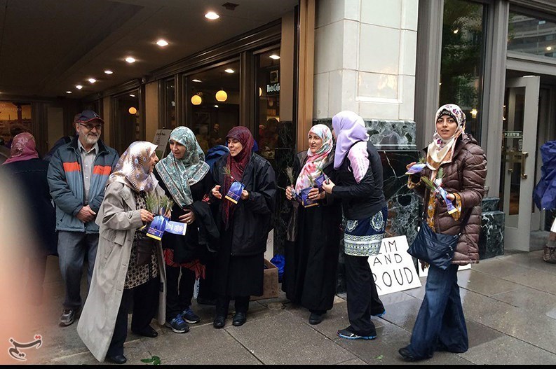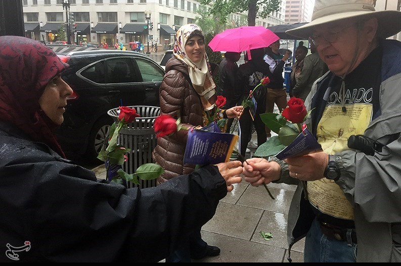 اهدای گُل به شهروندان آمریکایی به خاطر حمایت از مسلمانان در مقابل «ترامپ» + تصاویر