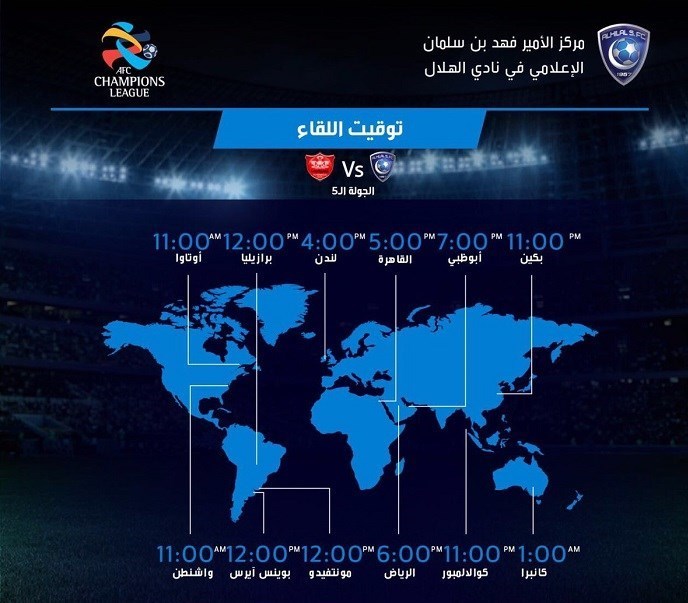 باشگاه الهلال عربستان در چند ساعت باقیمانده به آغاز رویارویی با پرسپولیس زمان بازی را به وقتهای 12 پایتخت مطرح دنیا برای هوادارانش منتشر کرد تا بتوانند از طریق تلویزیون و سایر ابزارهای تصویری به تماشای آن بنشینند. نام پکن، ابوظبی، قاهره، اوتاوا، برازیلیا، لندن، کانبرا، کوالالامپور، ریاض، مونتهویدو، بوینس آیرس و واشنگتن در پیام باشگاه الهلال عربستان قرار گرفته است.