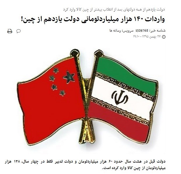 اما پس از چهار سال ماحصل دولت تدبیر و امید این شد که واردات کالاهای چینی از 60 هزار میلیارد تومان در 8 سال دولت قبل به حدود 140 هزار میلیارد تومان در دولت یازدهم رسید و نتیجهاش آن چیزی شد که در ادامه میبینیم.