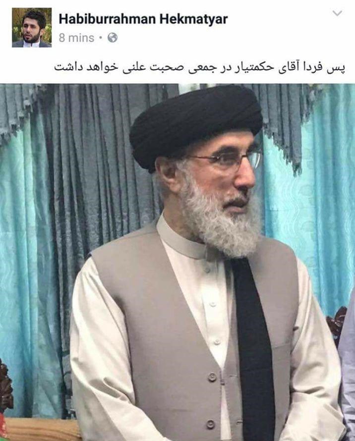 در همین حال ساعتی پیش «حبیبالرحمان حکمتیار» فرزند گلبدین حکمتیار در فیسبوک خود نوشت پسفردا حکمتیار در یک جمع عمومی سخنرانی خواهد کرد.