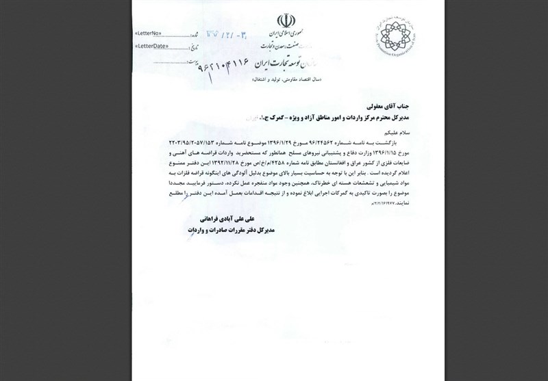 «بازگشت به نامه شماره 96/24562 مورخ 1396/1/29 موضوع نامه شماره 2203/2057/153 مورخ 1396/1/15 وزارت دفاع و پشتیبانی نیروهای مسلح همانطور که مستحضرید واردات قراضههای آهنی و ضایعات فلزی از کشور عراق و افغانستان مطابق نامه شماره 4258/م/خ/ص مورخ 1392/11/28 این دفتر ممنوع اعلام گردیده است. بنابراین با توجه به حساسیت بسیار بالای موضوع به دلیل آلودگیهایه اینگونه قراضه فلزات به مواد شیمیایی و تشعشعات هستهای خطرناک، همچنین وجود مواد منفجره عمل نکرده، دستور فرمایید مجددا موضوع را به صورت تاکیدی به گمرکات اجرایی ابلاغ نموده و از نتیجه اقدامات به عمل آمده، این دفتر را مطلع نمایند. 2/2/161977/م»