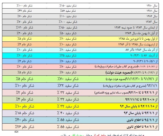 در حالی که در دوسال گذشته تعرفه واردات شکر سفید 55 درصد باقی مانده است، تعرفه شکر خام از 40 به 26 کاهش یافته بود. در جدول زیر تعرفه واردات شکر سفید و شکر خام از سال 80 قابل مشاهده است.