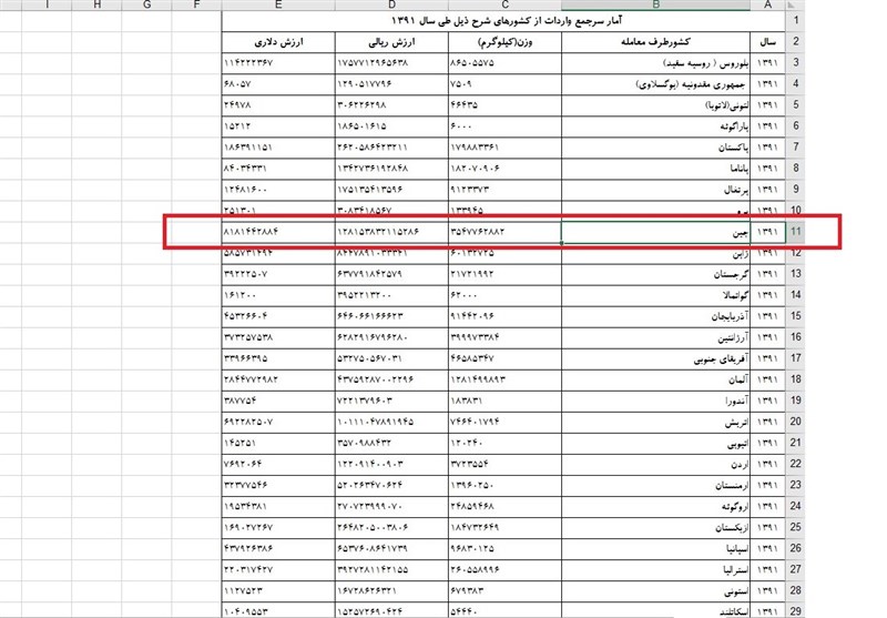 جداول زیر مربوط به واردات کالای چینی به کشور به ترتیب در سالهای 95 و 91 بوده که از آمار رسمی گمرک جمهوری اسلامی ایران گرفته شده است.