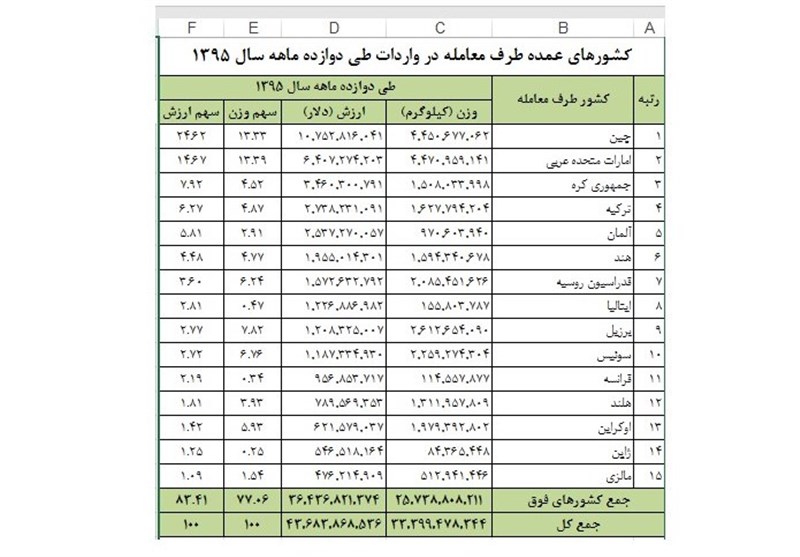 گفتنی است که ایران در سال 95 بیشترین واردات خود را از چین انجام داده است و امارات، کره جنوبی و ترکیه در رتبههای بعدی قرار دارند.