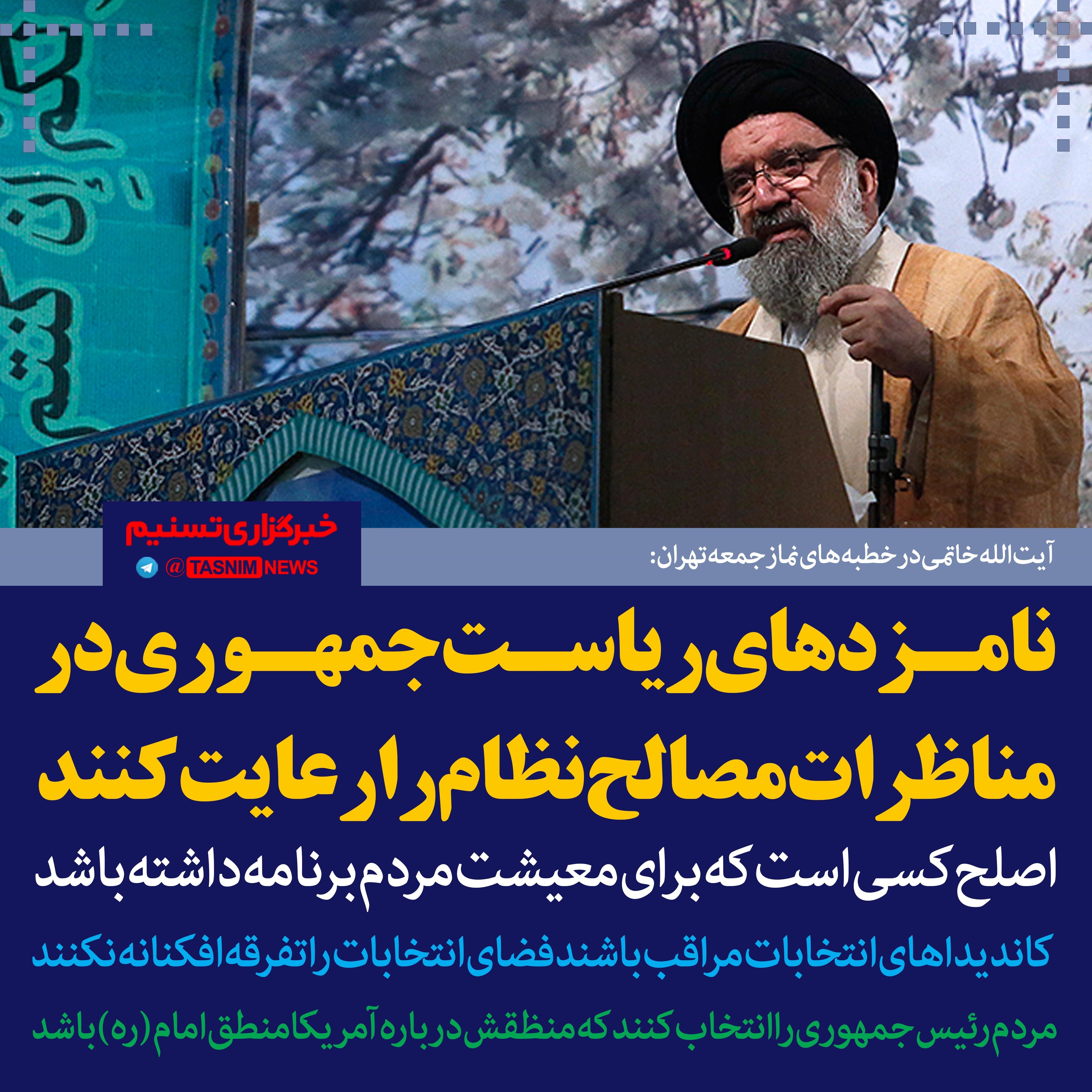خطیب نمازجمعه این هفته تهران در توصیه‌ای به هواداران کاندیداهای انتخابات ریاست‌جمهوری گفت: کاندیداها و هواداران آنها از تخریب یکدیگر بپرهیزند.