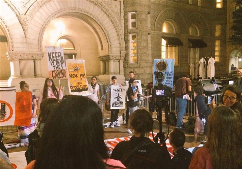 شماری از این معترضان متعلق به قبایل بومی از سراسر آمریکا بودند که به مناسبت صدمین روز روی کار آمدن دونالد ترامپ مقابل هتل وی جمع شدند تا بر حفاظت از محیط زیست در دولت ترامپ تاکید کنند.