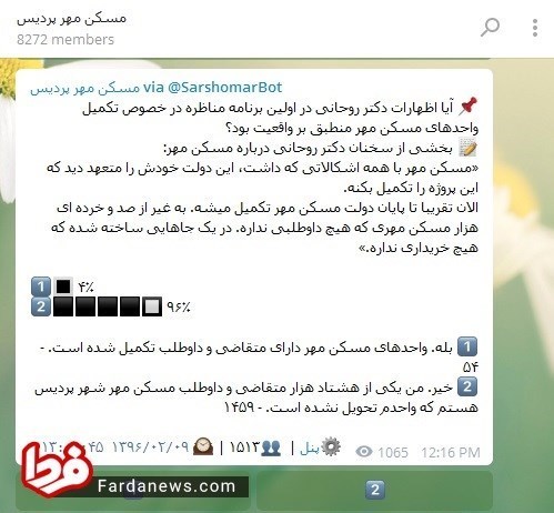 در این نظرسنجی که 1513 متقاضی شرکت کرده اند، 96 درصد آن‌ها واحدهایشان را تحویل نگرفته و فقط 4 درصد آن‌ها اظهارات حسن روحانی را مبنی بر تحویل واحدهای مسکن مهر تایید کرده‌اند.