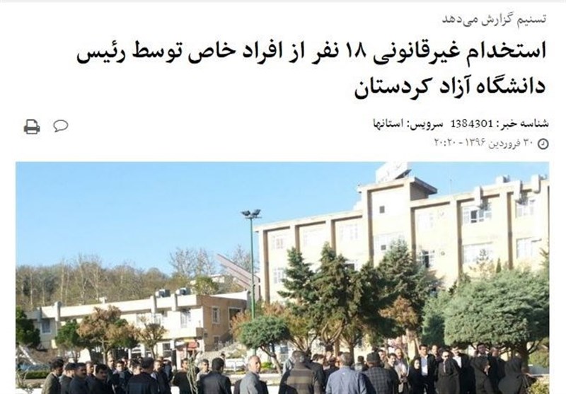 این اظهارات کارکنان دانشگاه آزاد اسلامی واحد سنندج در حالی مطرح شده که عبدالمحمد زاهدی استاندار کردستان 24 فروردین ماه سال گذشته در نخستین جلسه شورای اداری استان که خبرگزاری دولت خبر آن را منتشر کرده نسبت به استخدام و بکارگیری نیرو در ادارات براساس رابطههای فامیلی و پارتیبازی هشدار داده بود.