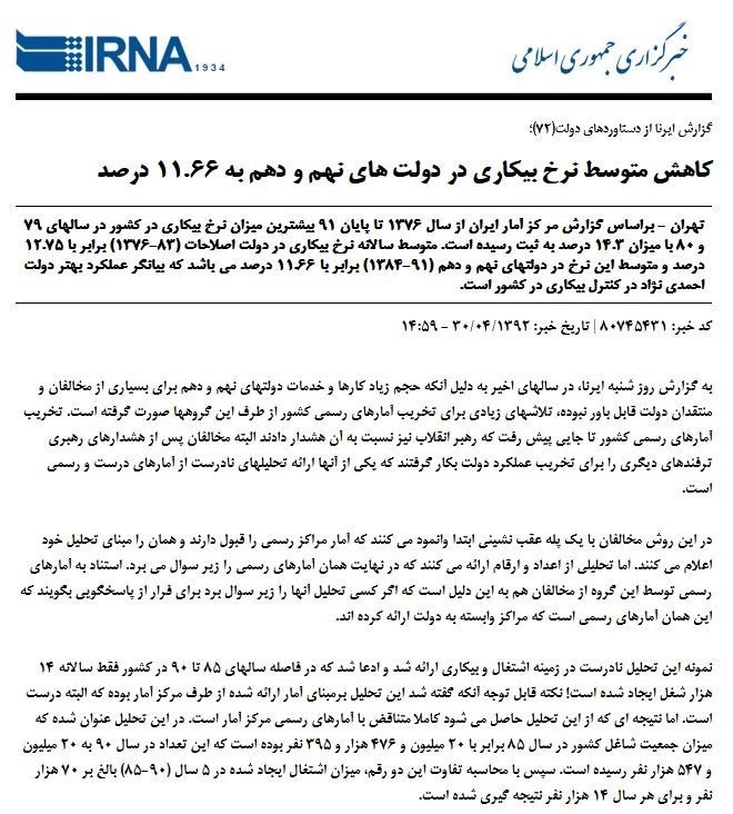 خبرگزاری دولتی ایرنا در این تحلیل، تمامی انتقادهای حسن روحانی به عملکرد اشتغالزایی دولت نهم و دهم را زیر سوال برده و غیرکارشناسی اعلام کرد.