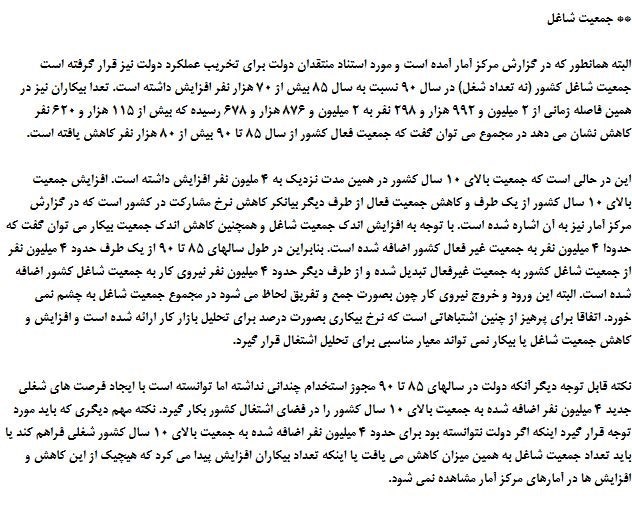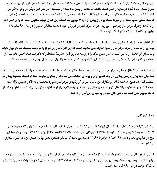 * در واقع باید گفت در دولت اصلاحات تعداد بیکاران تقریبا دو برابر شد اما در دولت احمدی نژاد تا پایان سال 90 تعداد بیکاران نه تنها افزایش نیافت بلکه با کاهش اندکی نیز مواجه شده است.