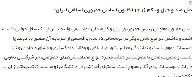 به گزارش تسنیم، اصل 141 قانون اساسی جمهوری اسلامی ایران میگوید: رئیسجمهور، معاونان رئیسجمهور، وزیران و کارمندان دولت نمیتوانند بیش از یک شغل دولتی داشته باشند و داشتن هر نوع شغل دیگر در مؤسساتی که تمام یا قسمتی از سرمایه آن متعلق به دولت یا مؤسسات عمومی است و نمایندگی مجلس شورای اسلامی، وکالت دادگستری و مشاوره حقوقی و نیز ریاست و مدیریت عامل یا عضویت در هیئت مدیره انواع مختلف شرکتهای خصوصی، جز شرکتهای تعاونی ادارات و موسسات برای آنان ممنوع است. سمتهای آموزشی در دانشگاهها و موسسات تحقیقاتی از این، حکم مستثنی است.