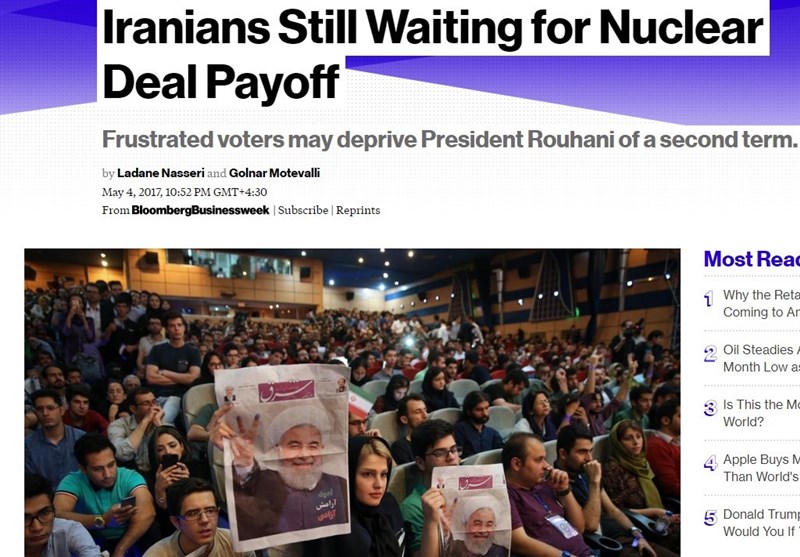 به گزارش گروه بین الملل خبرگزاری تسنیم، پایگاه خبری «بلومبرگ» در خبری نوشت درحالیکه کمتر از دو هفته به زمان برگزاری انتخابات ریاست جمهوری در ایران باقی مانده است، مردم ایران همچنان منتظر هستند تا شاهد نتیجه نهایی توافق هسته ای کشورشان باشند.