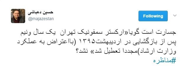 دهباشی در صفحه شخصی خود در توئیتر نوشت که جسارت است گویا «ارکستر سمفونیک تهران یک سال ونیم پس از بازگشایی در اردیبهشت 1395 (با اعتراض به عملکرد وزارت ارشاد) مجددا تعطیل شد» نشد؟