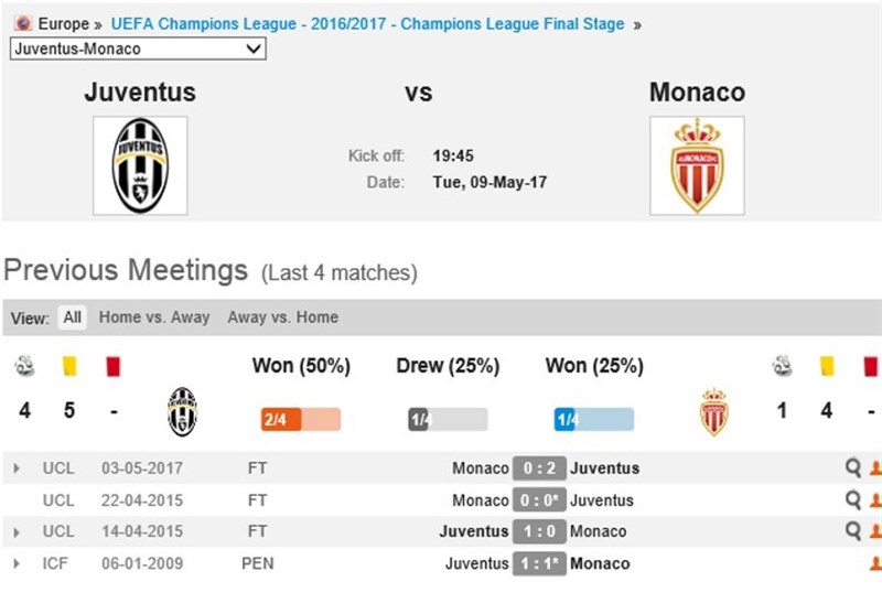 با احتساب بازی رفت، 2 تیم 5 بار به مصاف هم رفتهاند که یووه 3 بار پیروز شده و یک بار تن به تساوی داده است. یک بازی هم با برتری موناکو خاتمه یافت. اگر یوونتوس به فینال برسد در واقع برای سومین بار در 3 مرحله متفاوت موفق به حذف موناکو در بالاترین سطح فوتبال باشگاهی اروپا شده است.