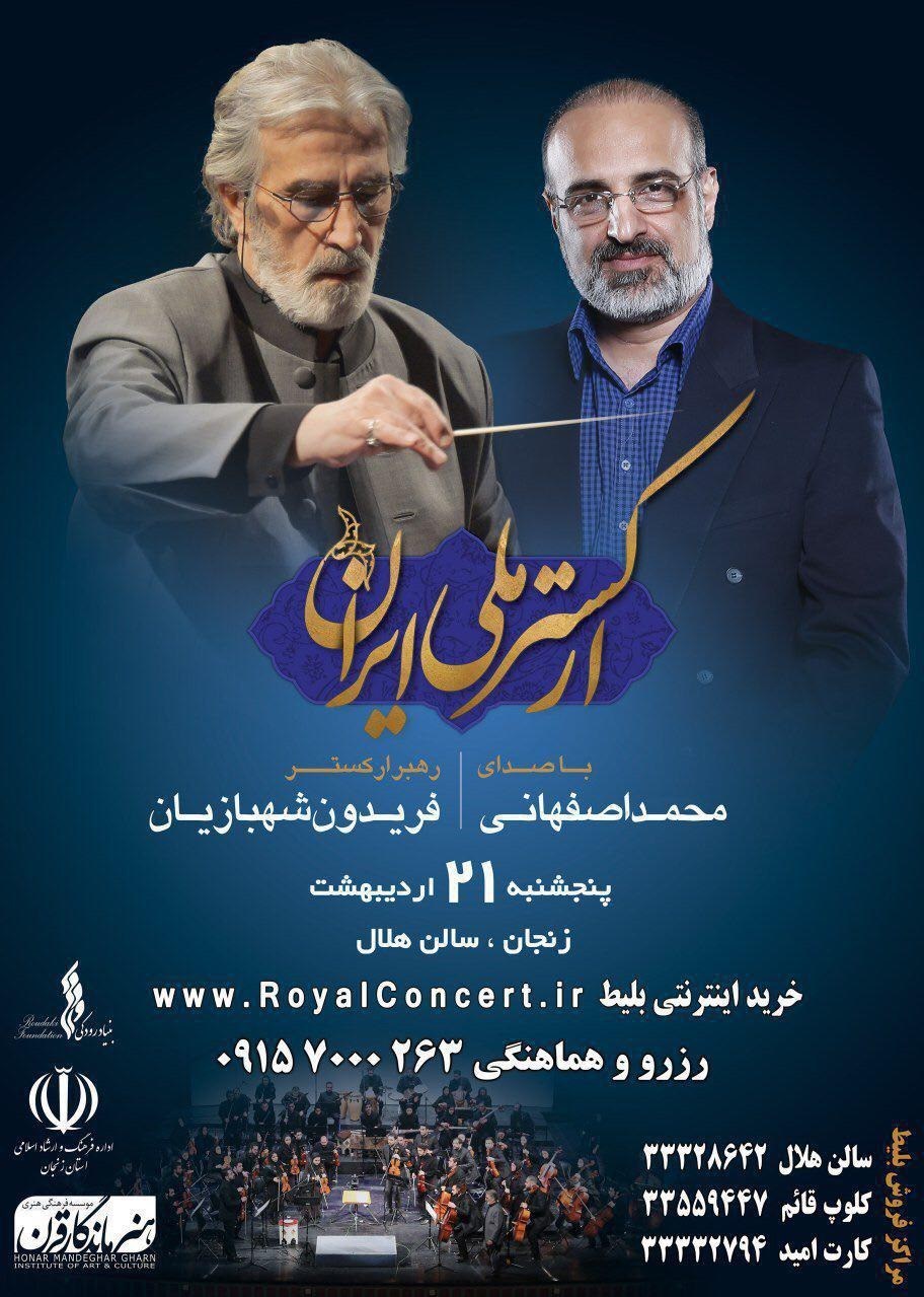 به گزارش باشگاه خبرنگاران پویا، کنسرت ارکستر ملی در زنجان پنجشنبه 21 اردیبهشت 1396 اجرا میشود. در این کنسرت قطعاتی چون «اوج آسمان»، «تنها ماندم»، «شورآفرین»، «روزی تو خواهی آمد» و «ای تو همیشه در میان»، «گریز» و قطعات «تو ای پری کجایی»، «مهر و ماه»، «سرود گل»، «بوی باران» و «افسانه» اجرا میشود.