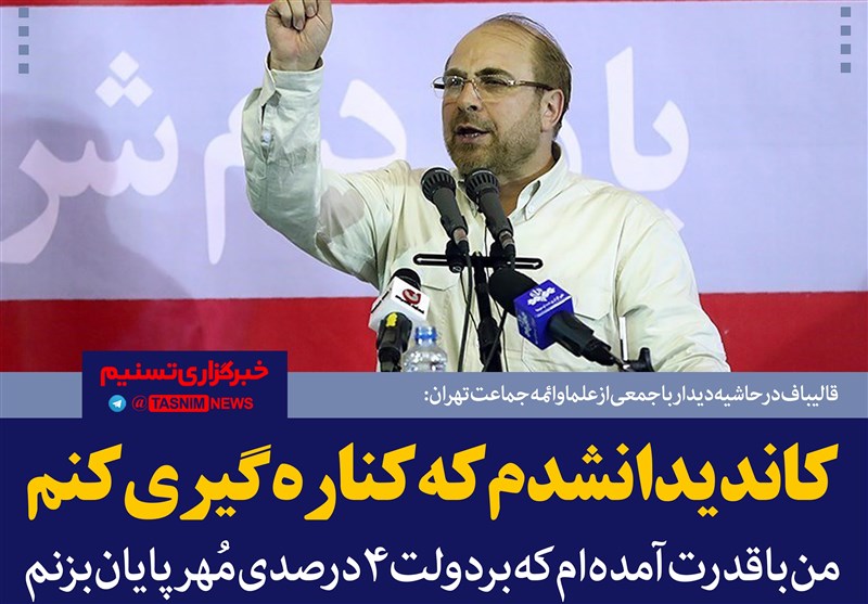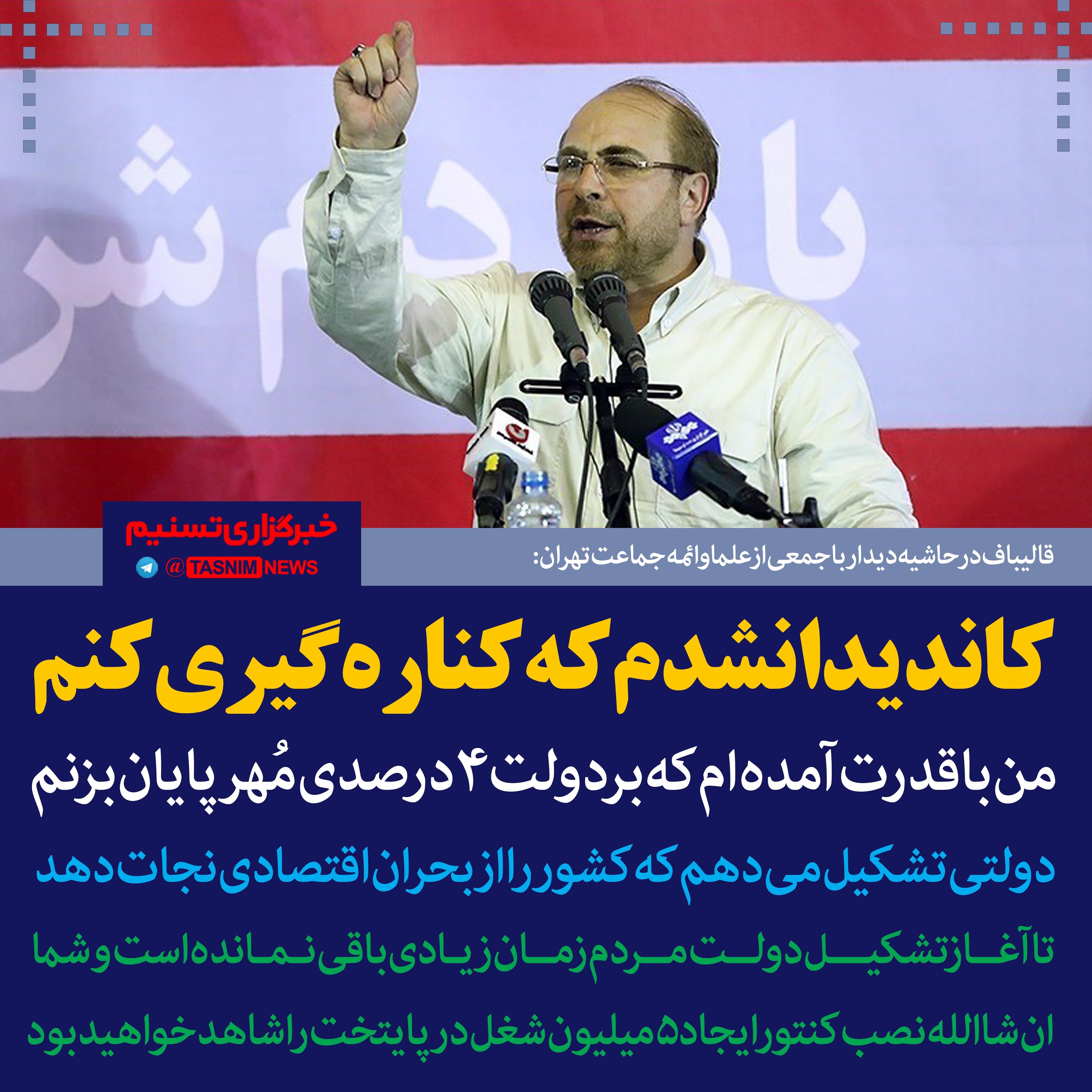 محمدباقر قالیباف تصریح کرد: من نامزد انتخابات ریاست‌جمهوری نشدم که کناره‌گیری کنم و با قدرت آمده‌ام که بر دولت 4درصدی مهر پایان بزنم.