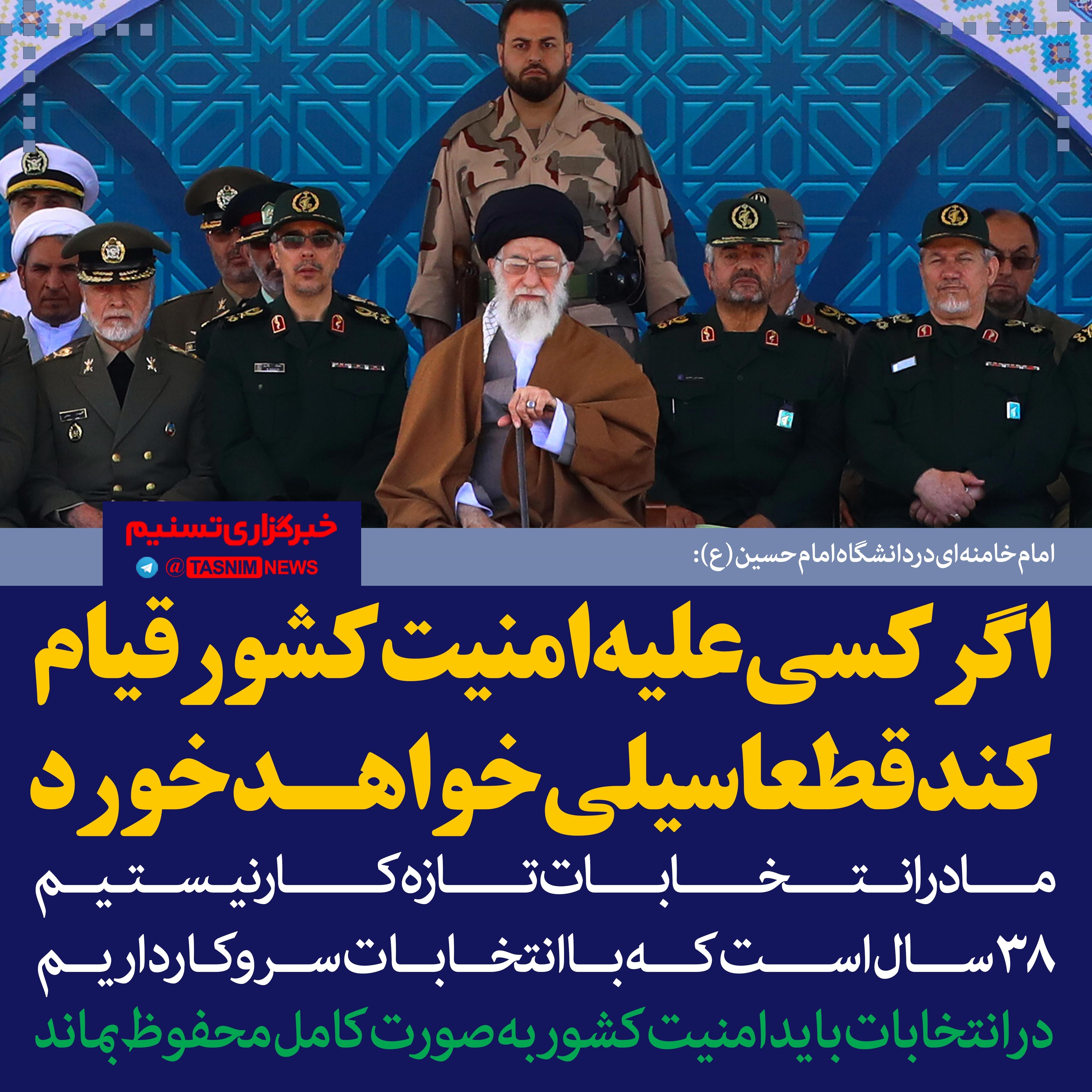 رهبر انقلاب صبح امروز در دانشگاه امام حسین (ع) فرمودند: مسئله‌ی امنیت و آرامش در انتخابات بسیار مهم است. مسئولان از قوه‌ی قضائیه، از نیروی انتظامی، از وزارت کشور و بقیه- همه باید مراقبت کنند امنیت حفظ شود.