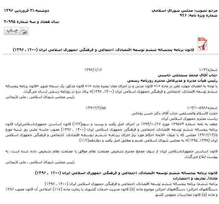 اسناد روزنامه رسمی کشور هم نشان میدهد علیرغم انتشار قانون برنامه ششم توسعه در تاریخ 21 فروردین 96 در رورنامه رسمی و ابلاغیه علی لاریجانی رئیس مجلس به رئیس جمهور، آقای حسن روحانی خلاف رویه گذشته که قوانین ابلاغی به رئیس جمهور را به دستگاه مسئول ابلاغ میکرد، قانون برنامه ششم را هنوز ابلاغ نکرده است و کشور طی دو ماه اول سال 96 بدون برنامه اداره میشود.