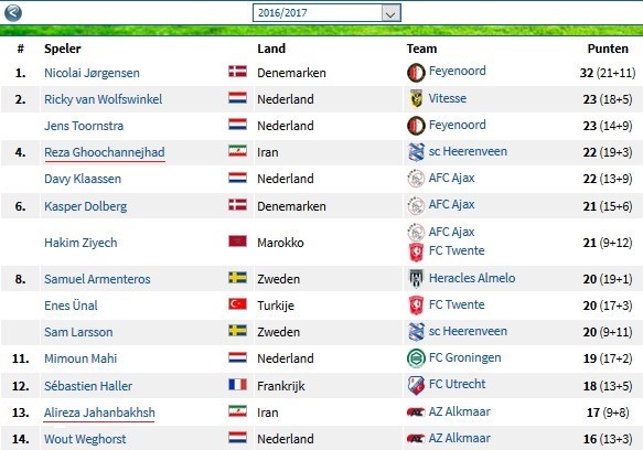 همچنین علیرضا جهانبخش، ملیپوش ایرانی تیم آلکمار با امتیاز 17 که از مجموع 9 گلزده و هشت پاس گل به دست آمد رتبه سیزدهم برترین بازیکنان و پاسورهای فصل اخیر اردویژه هلند را به دست آورده است.
