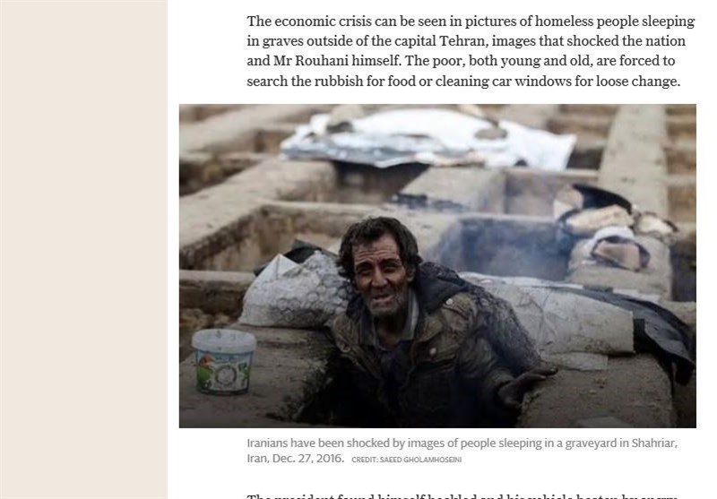 تلگراف نوشت که بحران اقتصادی ایران را در بیخانمانهایی که در گورها میخوابند، همچنین جستجوی فقرا و جوانان و کهنسالان در سطلهای آشغال برای یافتن غذا یا پاک کردن شیشه خودرها برای به دست آوردن اندکی پول میتوان مشاهده کرد.