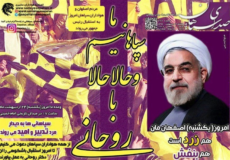 این در حالیاست که روزنامه صدای سپاهان نیز که روزنامه هواداری این باشگاه به شمار میرود، در نسخه امروز خود، تمام مطالب خود را در راستای حمایت از روحانی تنظیم کرده و از هواداران سپاهان درخواست کرده تا با حضوری پرشور در میدان امام (ره) استقبال بی نظیری را از رئیس جمهور خود به عمل آوردند.